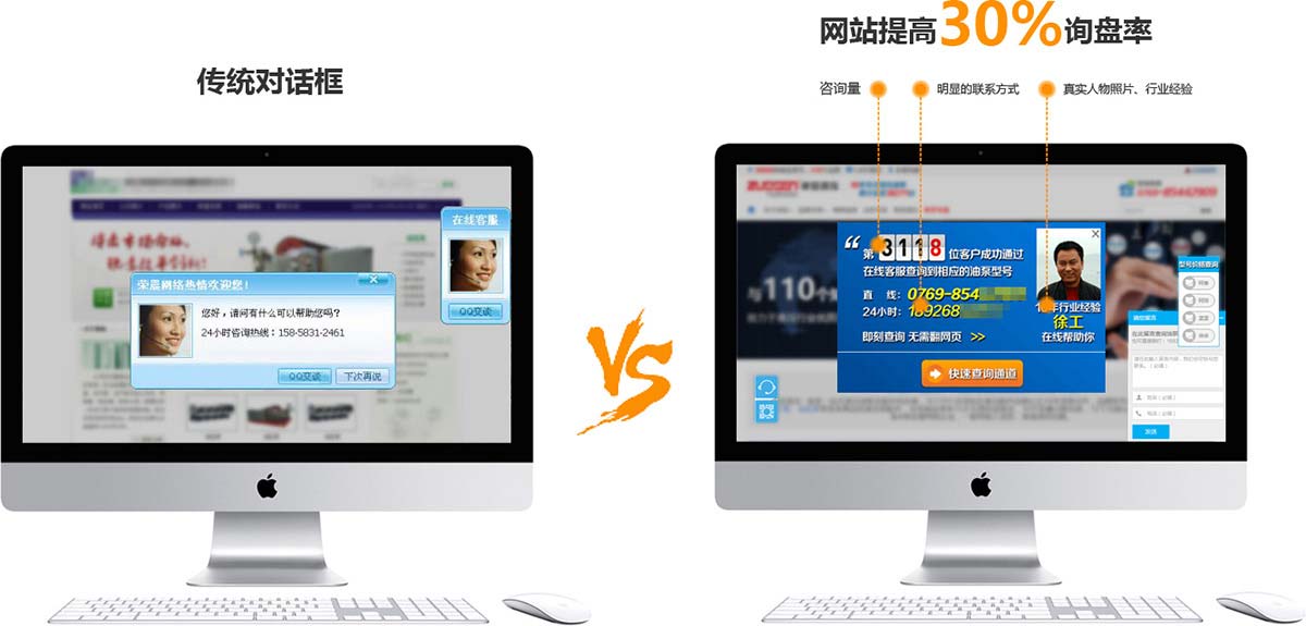 你注意过对话框么?我们做的,可以让你提高30%询盘率。关键要素:咨询量、明显的联系方式、真实人物照片、行业经验,都应该是展现的重点。